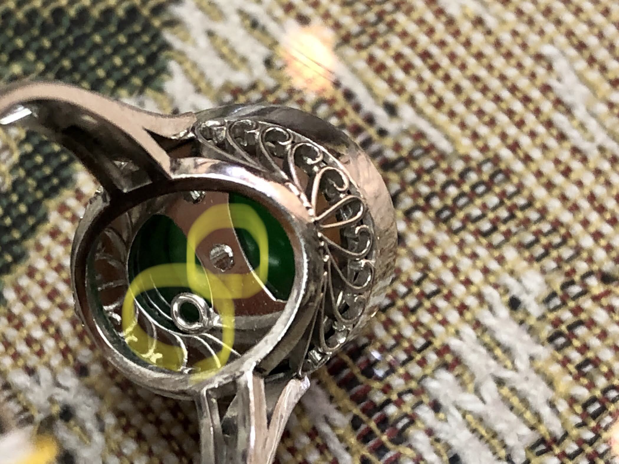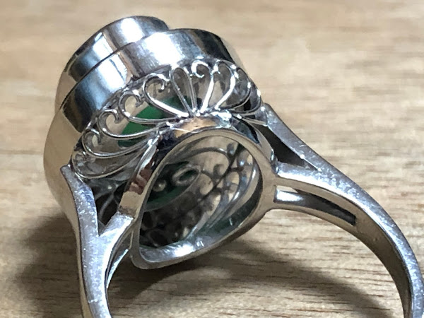 何が面白いかというと、元々翡翠が覆輪留めのために、タイタックに直接ロウ付けすると熱が伝わる。普通はそこで無理だと断る場合も多いだろうが、このリングは、タイタック丸ごと覆輪留めする事で熱問題をクリア✨しかも、正面から見て全然わからない。アイデアと技のリングなのです✨