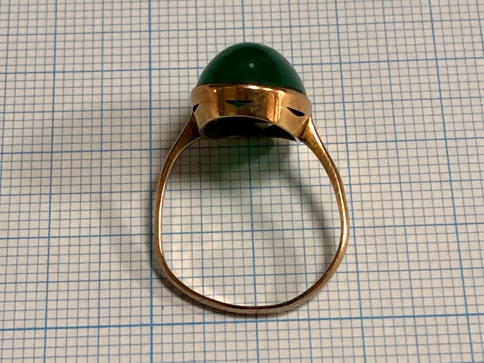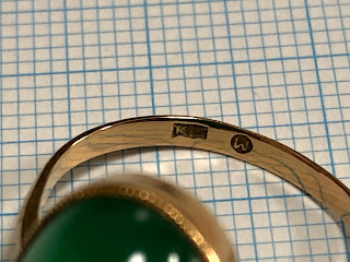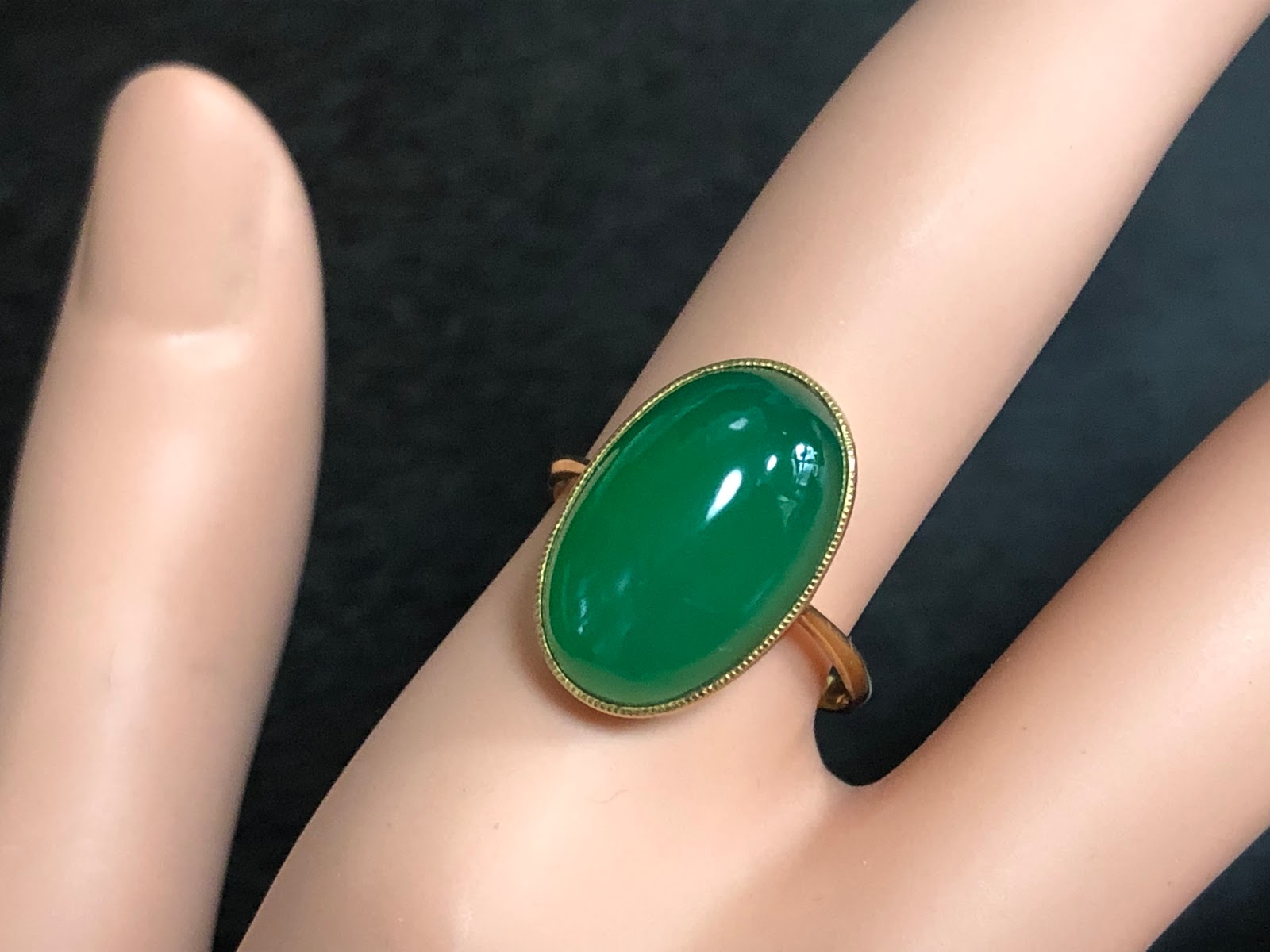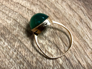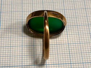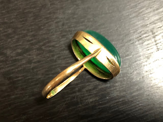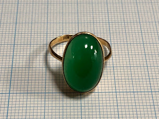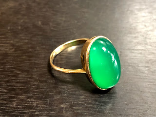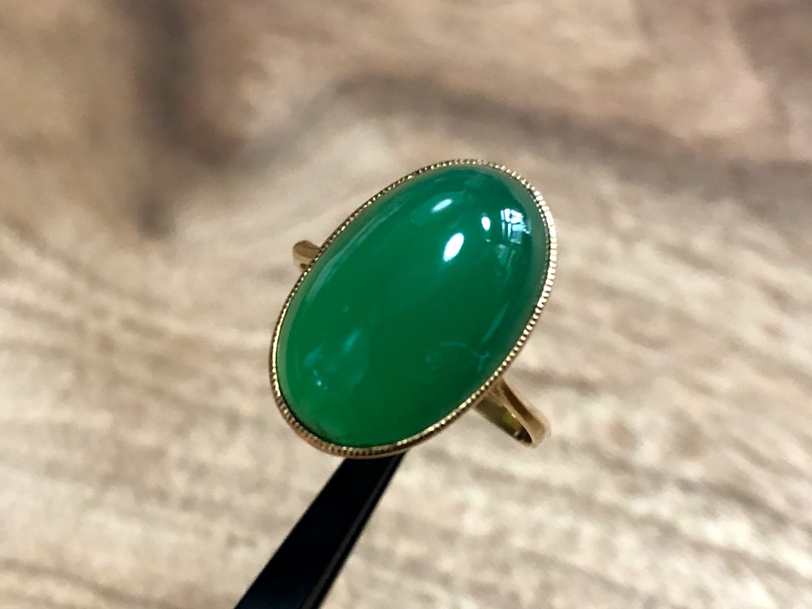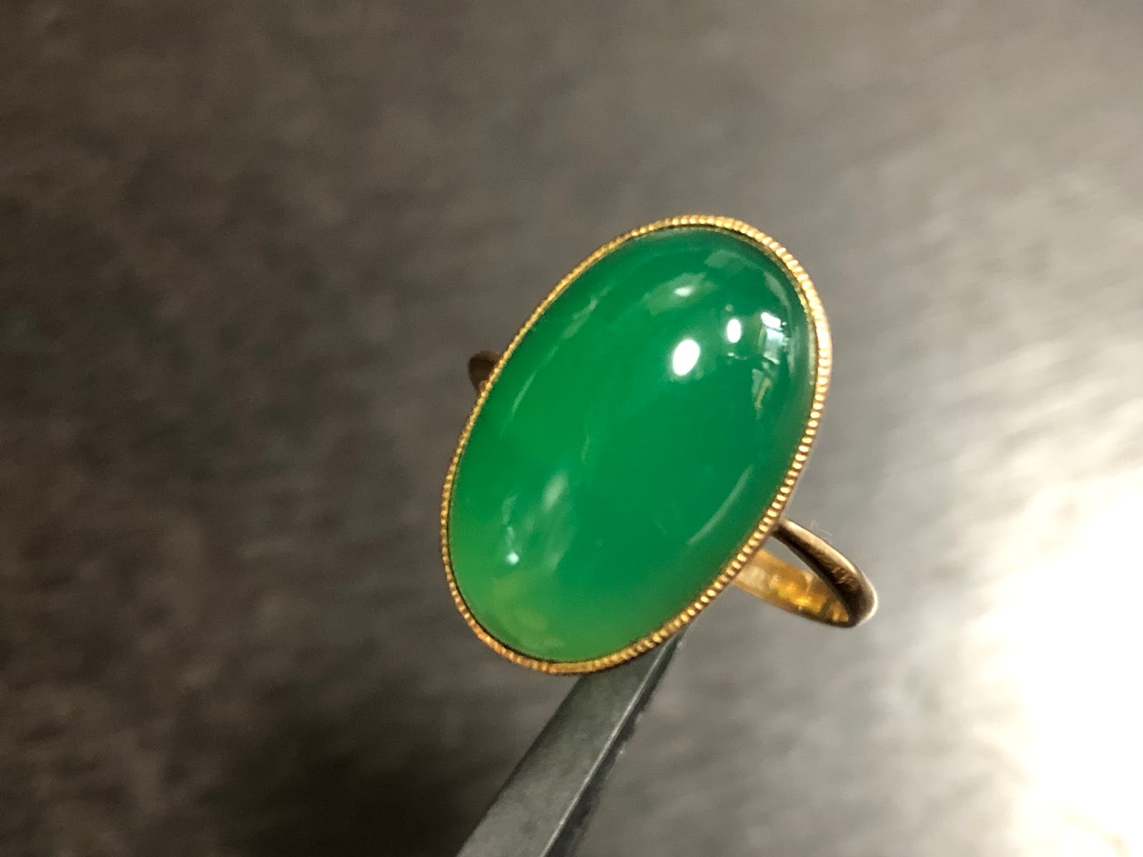 オーバルのカルセドニーに覆輪留め&ミル打ちのハンドメイドリング。アームは鋳造かもしれません。