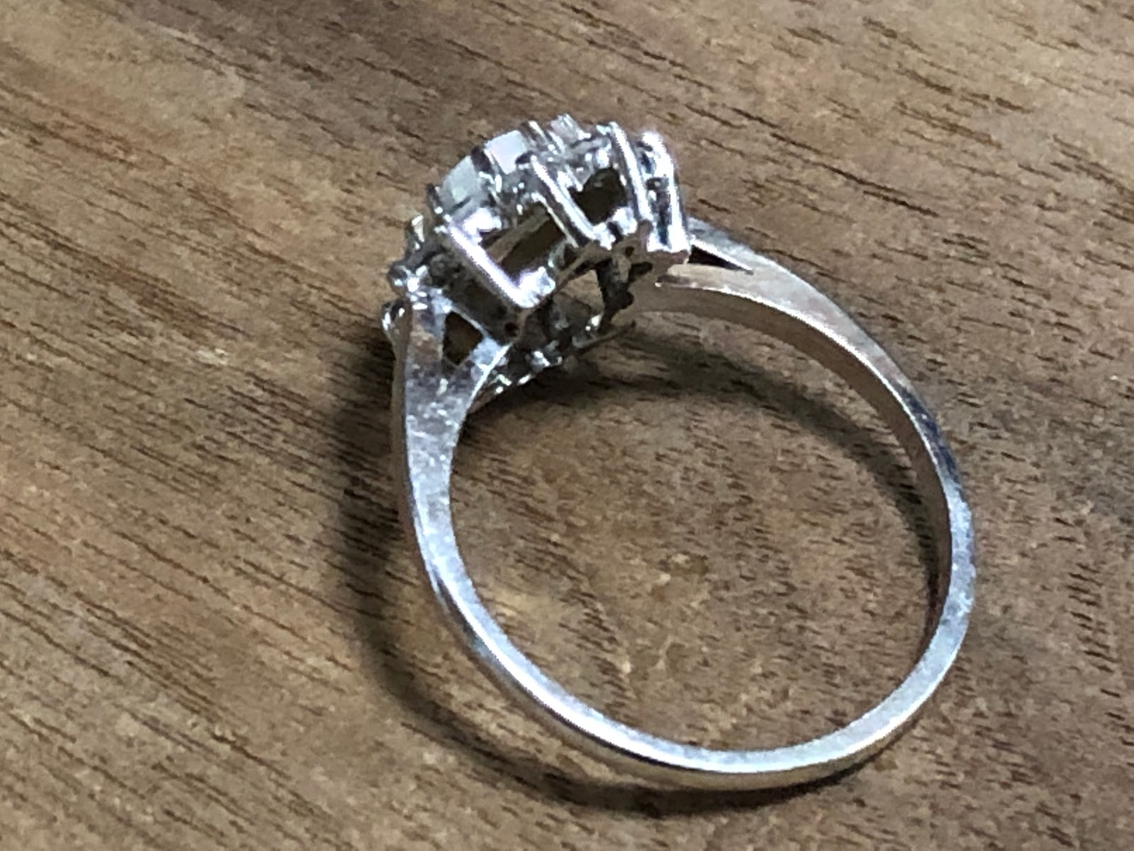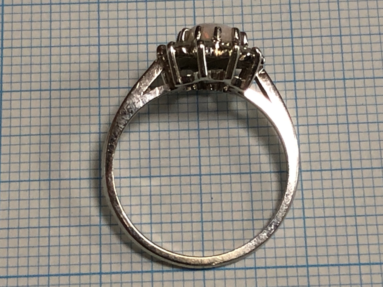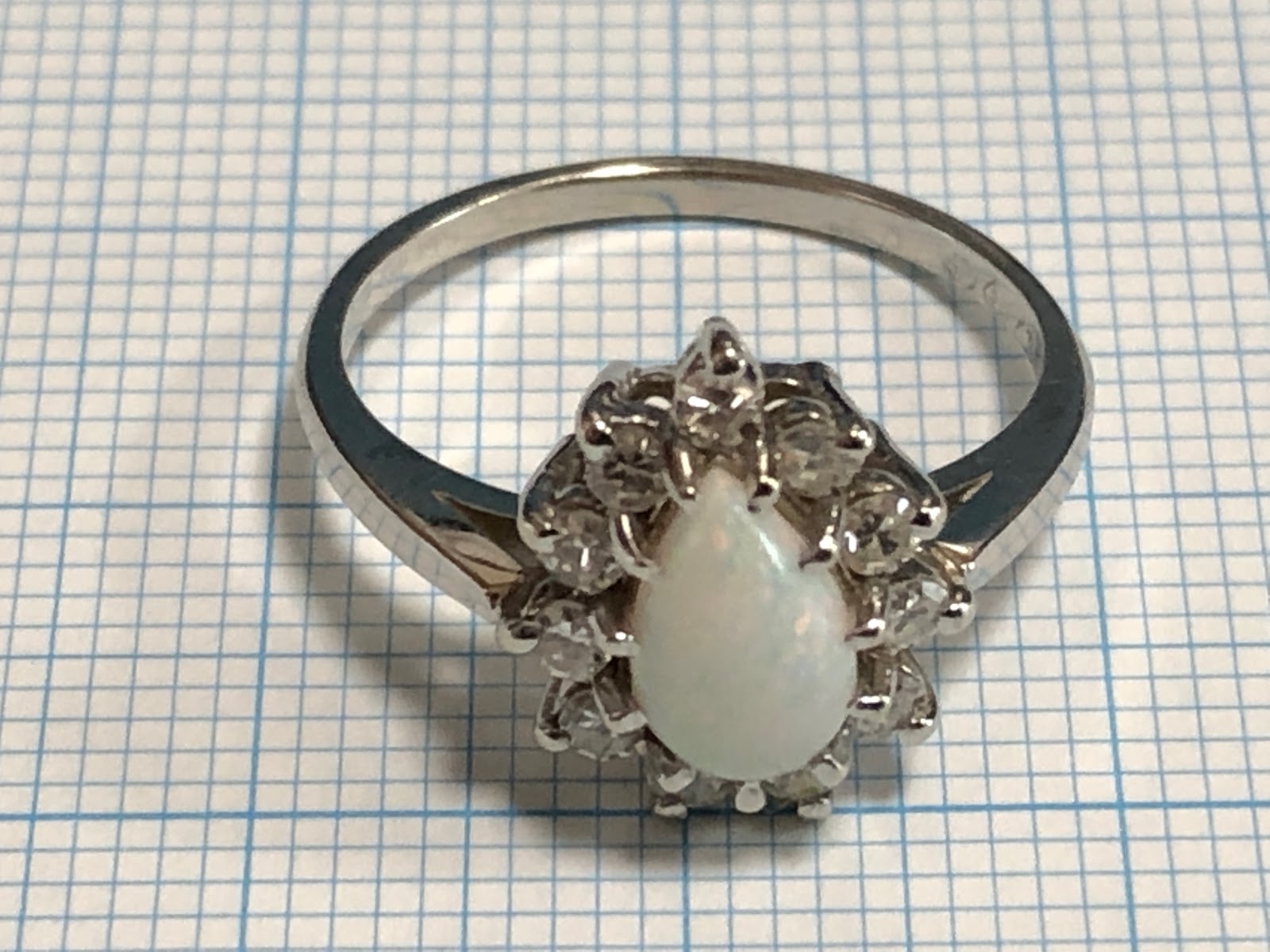 綺麗な白地に淡く細かい色彩のオパールに、シングルカットのダイヤモンドの取り巻きとなれば、