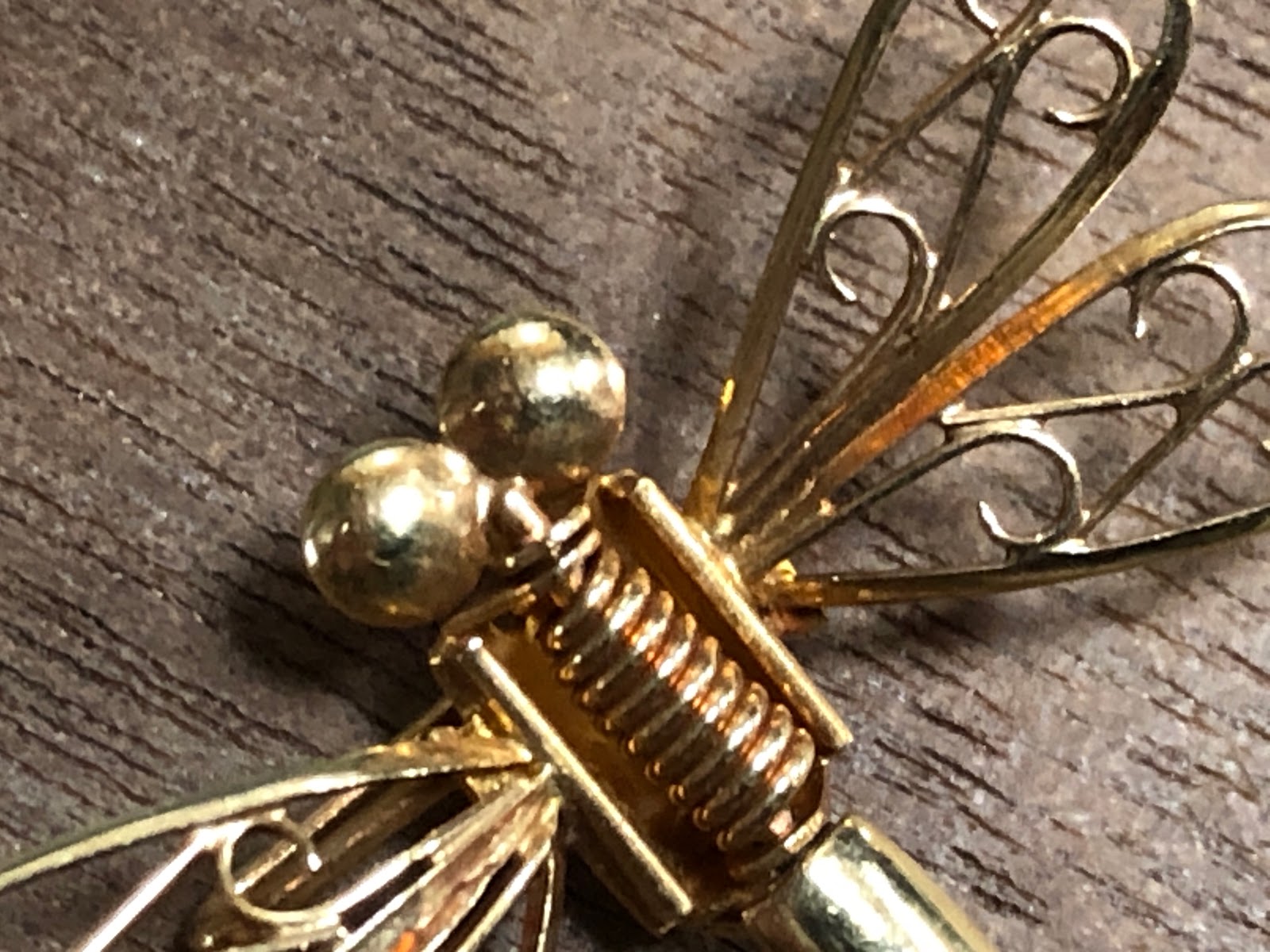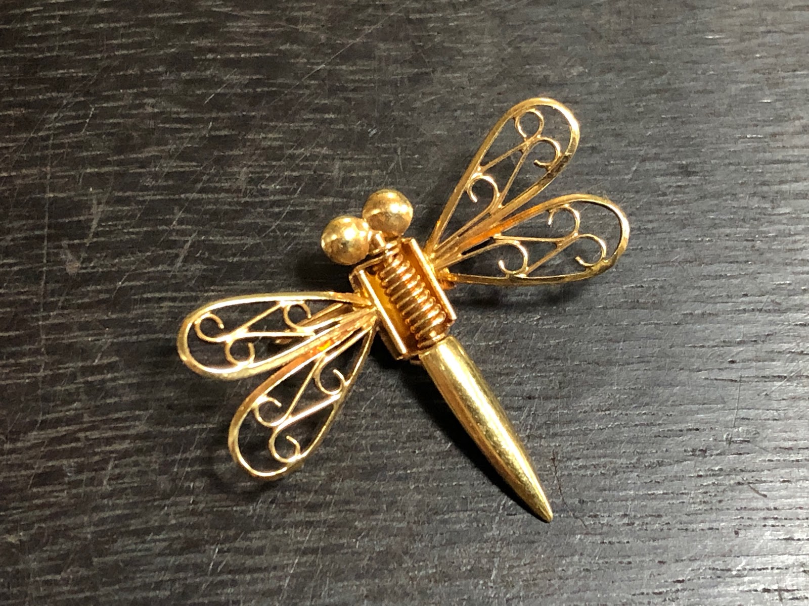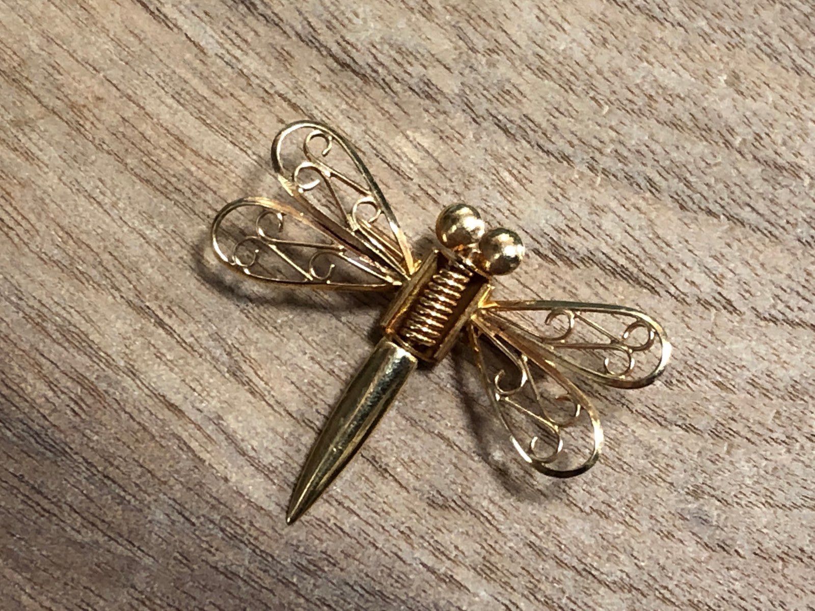 金線を巻いたバネを使った昭和のショール留め、ブローチ。仕上げ済みの記念写真📸バネを胴体に、針を足に見立てたナイスデザイン。数十年経てもバネはしっかり効いています。説明には伏せてましたが、トンボははじめて見ました。めっちゃ珍しいっす。納品済みです✨✨✨ pic.twitter.com/AiK5GGqzYd