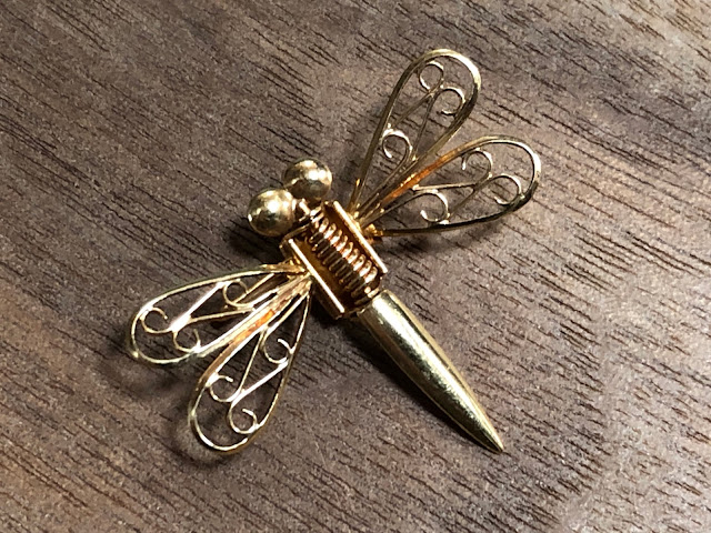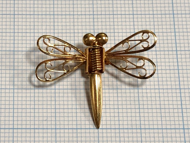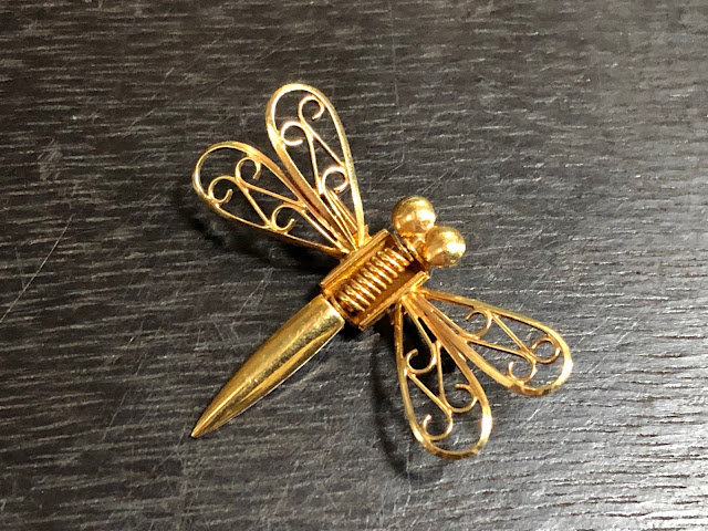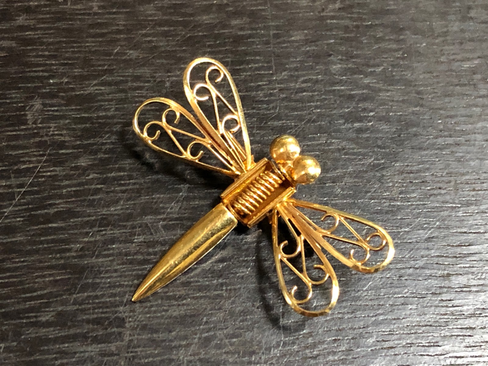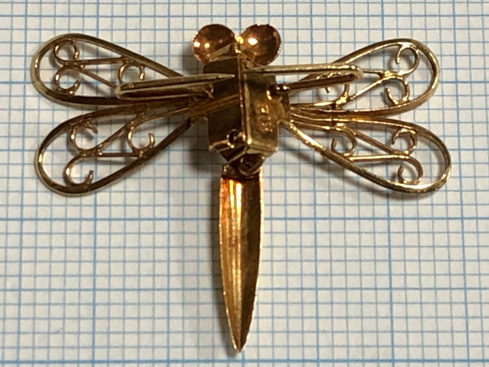 金線を巻いたバネを使った昭和のショール留め、ブローチ。仕上げ済みの記念写真📸バネを胴体に、針を足に見立てたナイスデザイン。数十年経てもバネはしっかり効いています。説明には伏せてましたが、トンボははじめて見ました。めっちゃ珍しいっす。納品済みです✨✨✨ pic.twitter.com/AiK5GGqzYd