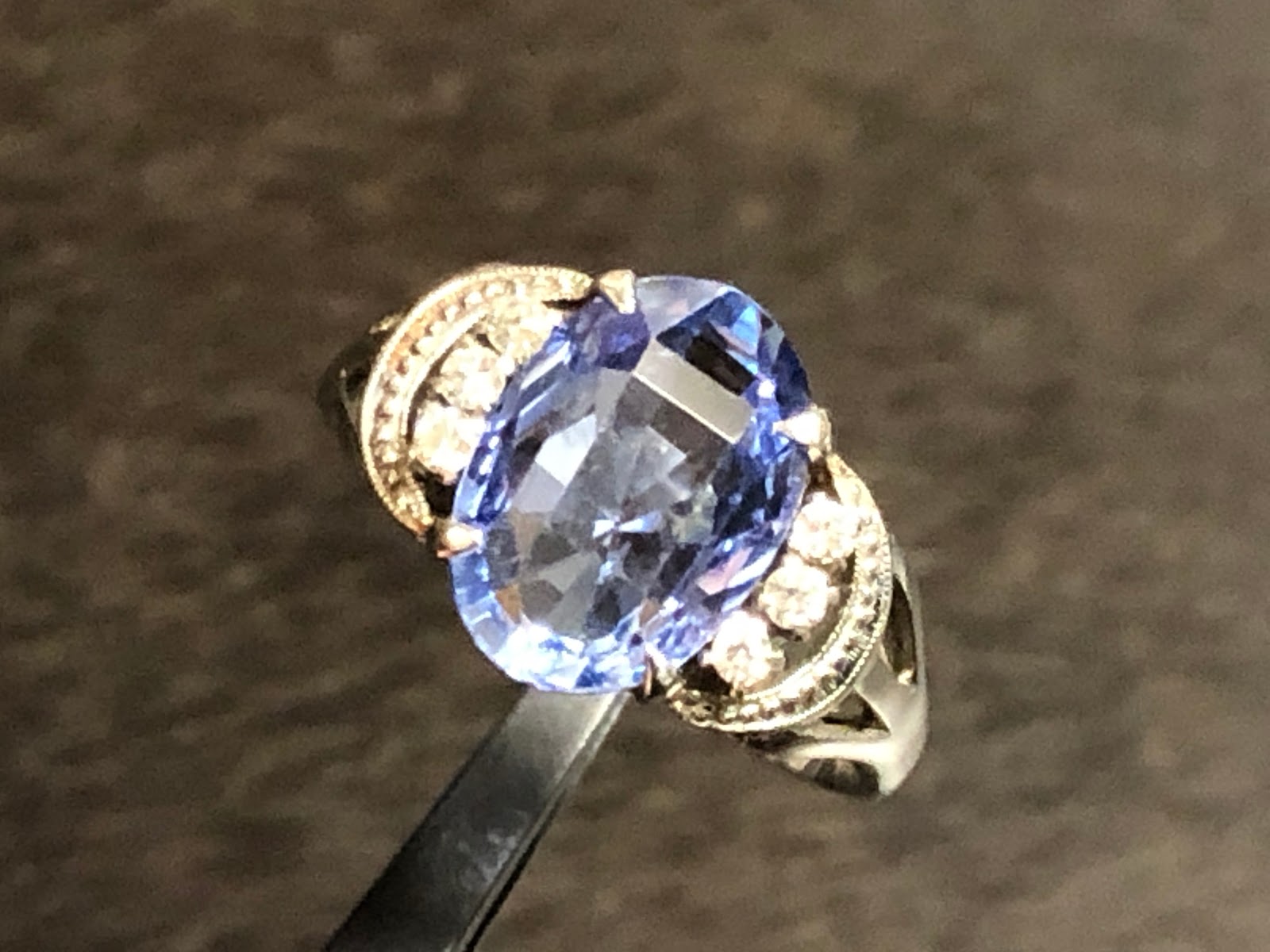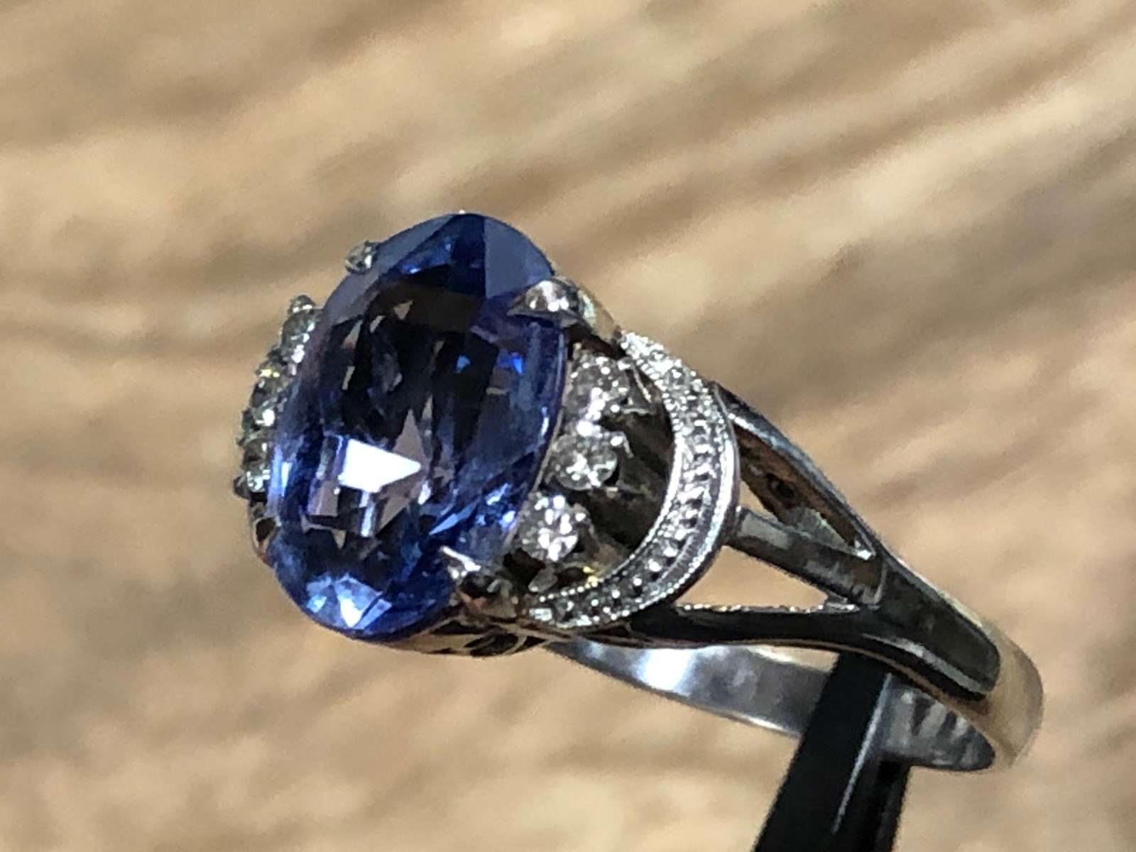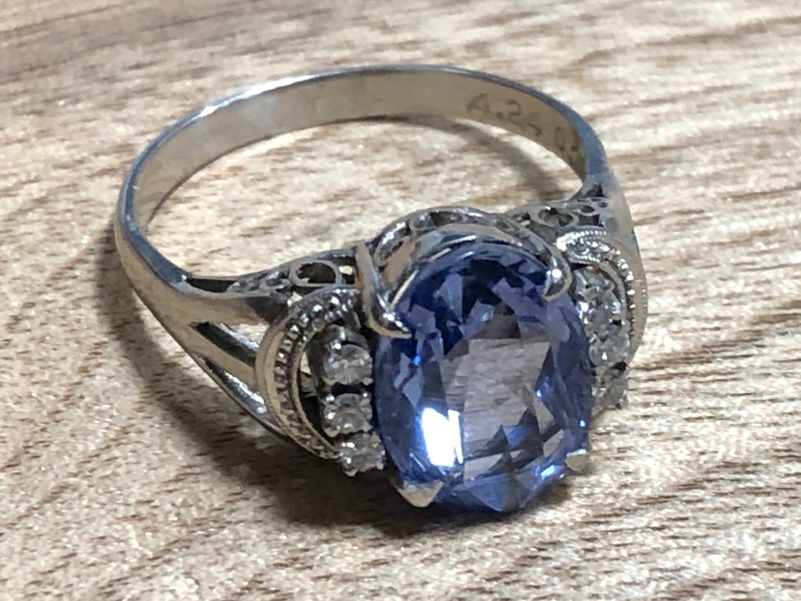 木の板背景のサファイアより実物はちょっと薄い色です