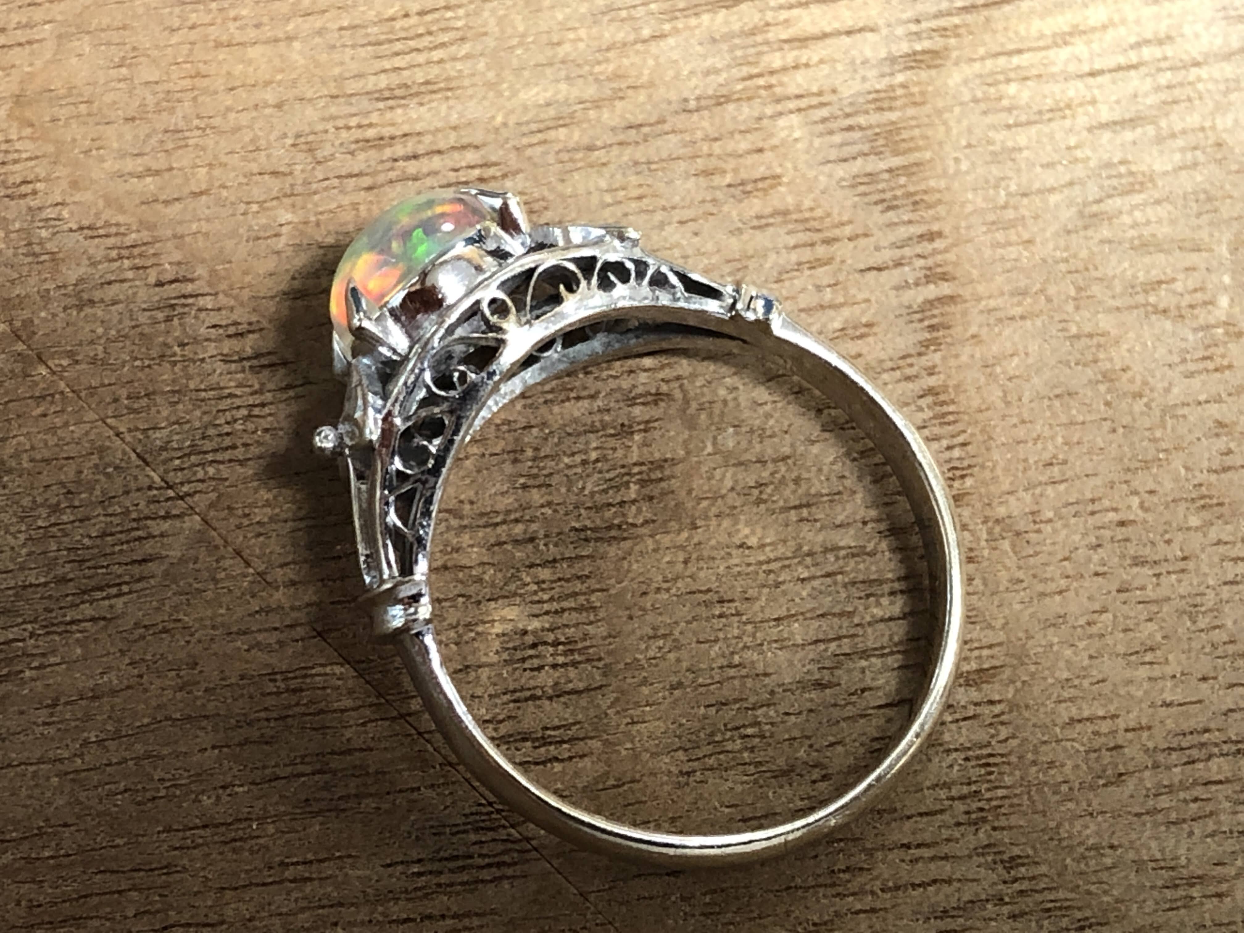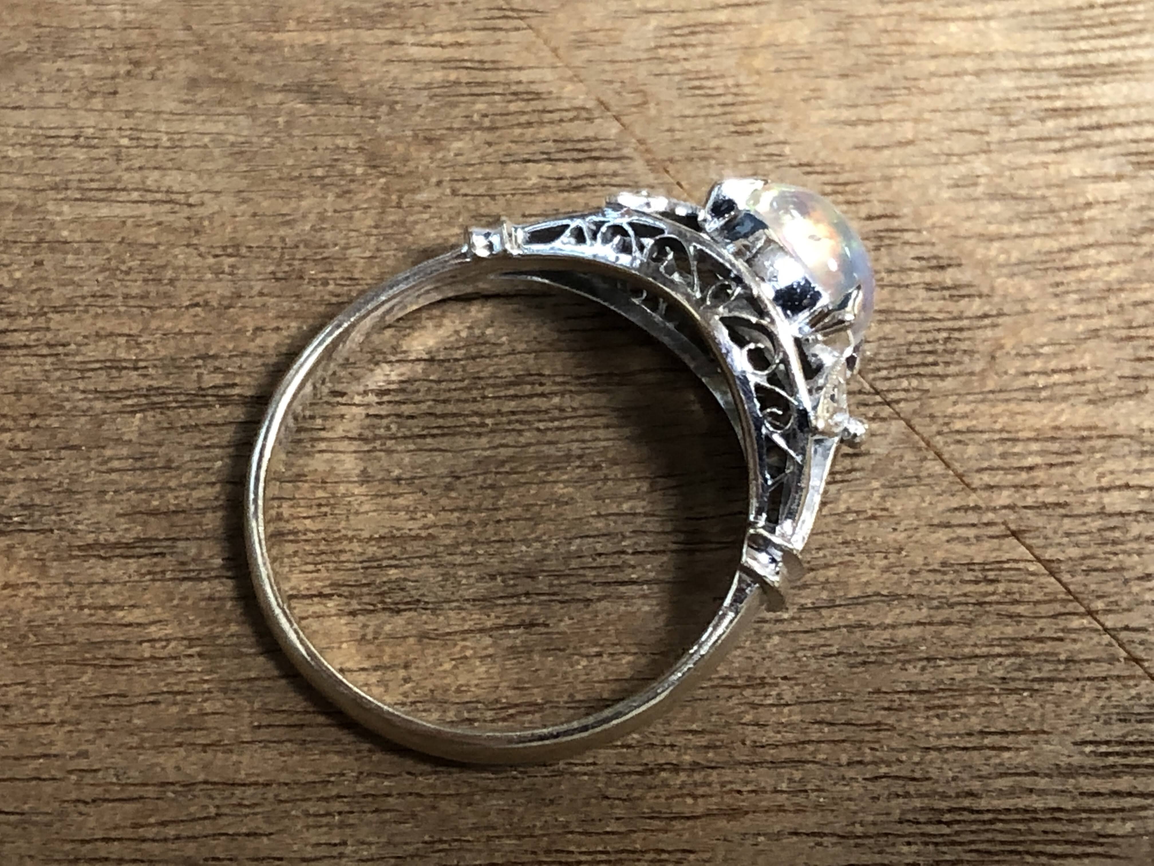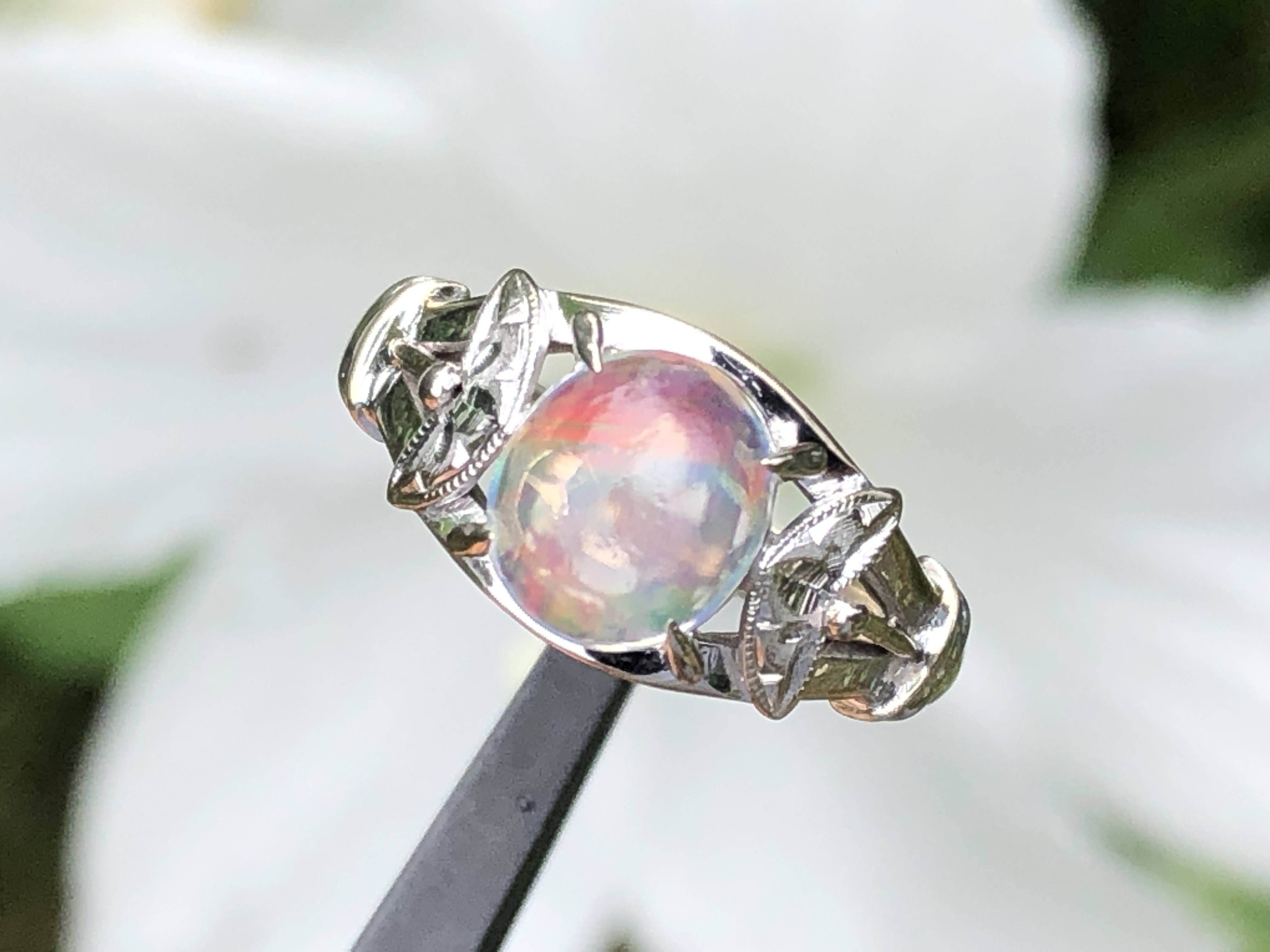 ウォーターオパール 手巻き唐草、和彫り、ミル打ち K14WG リング #13 昭和 /07232