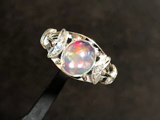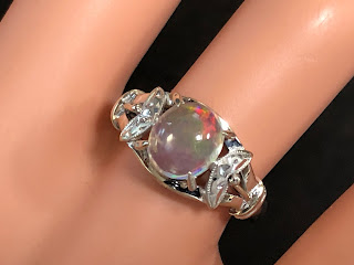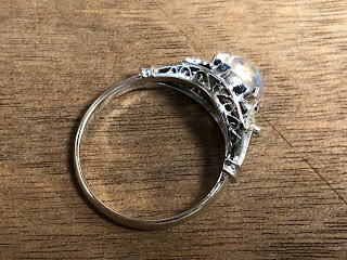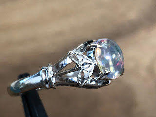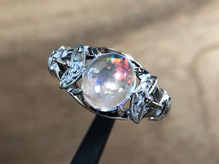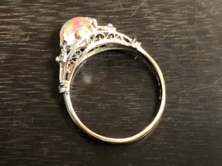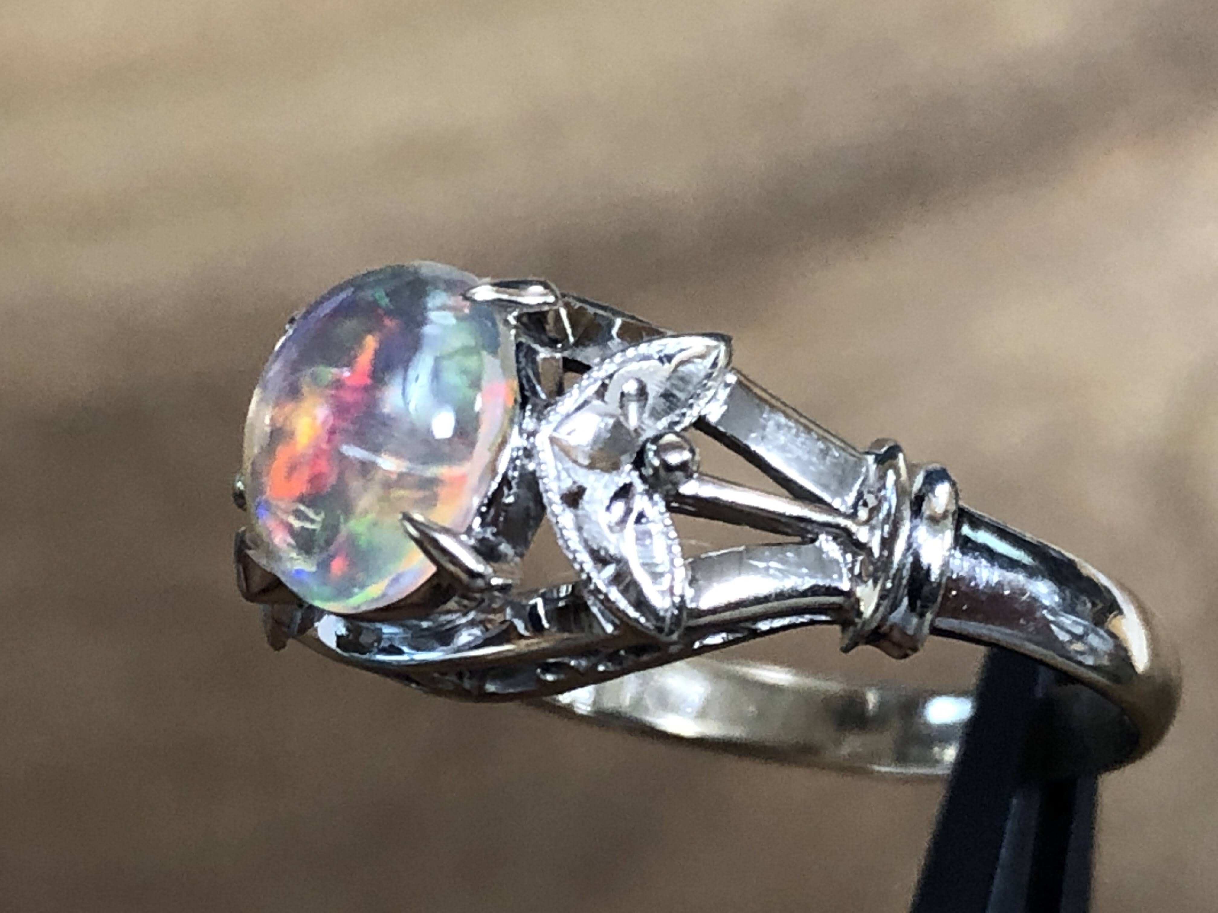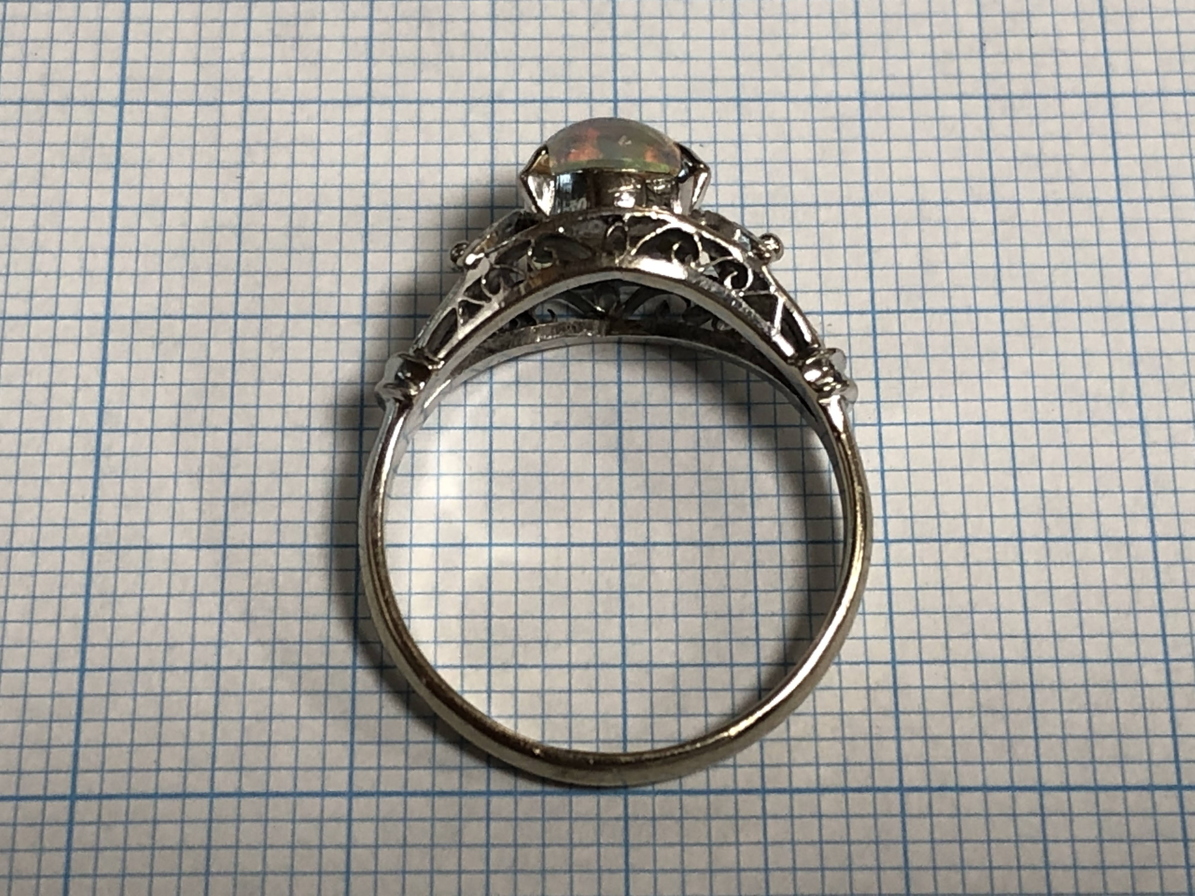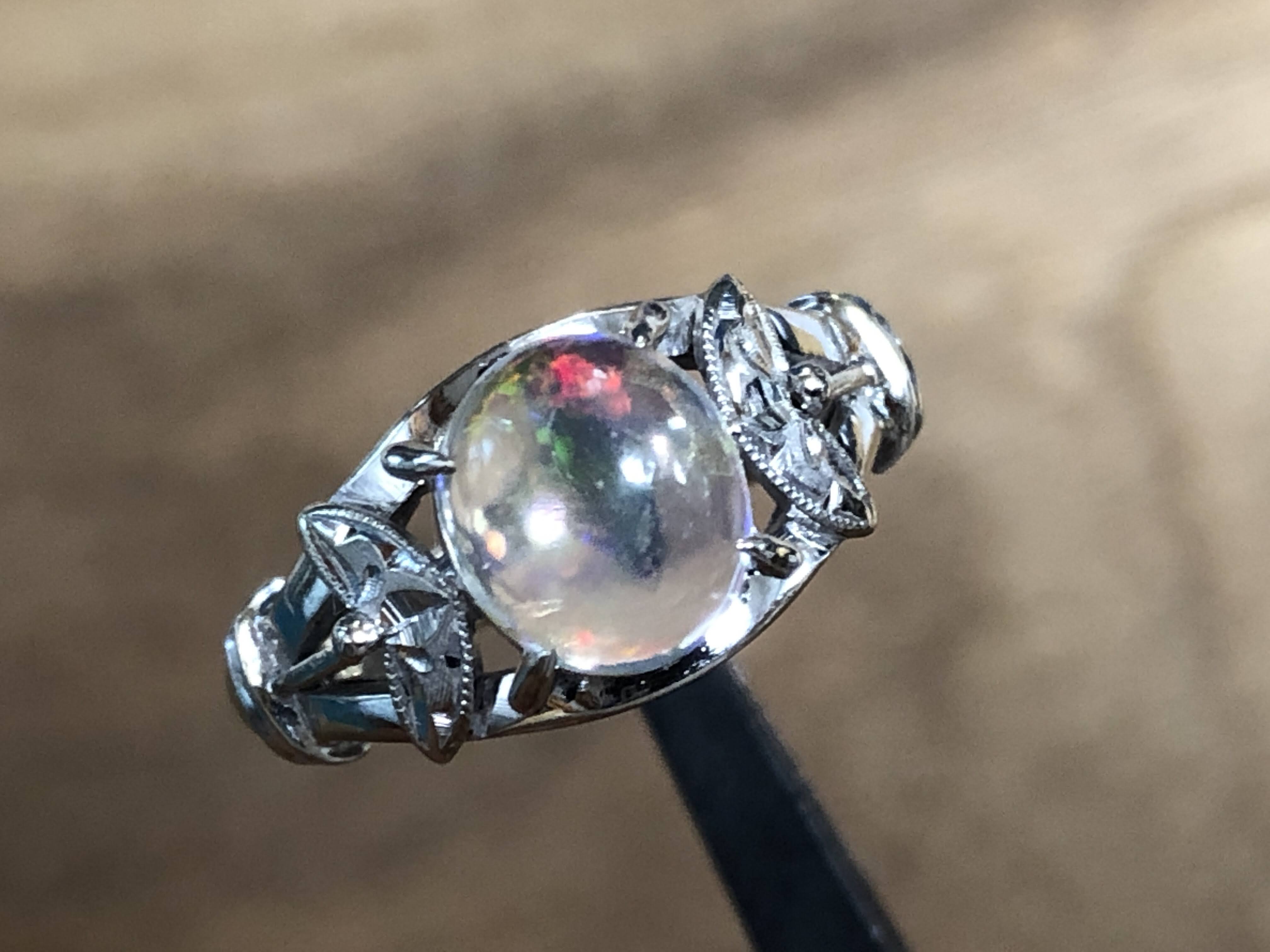 ウォーターオパール 手巻き唐草、和彫り、ミル打ち K14WG リング #13 昭和 /07232