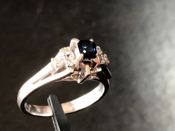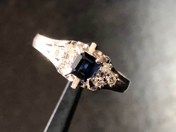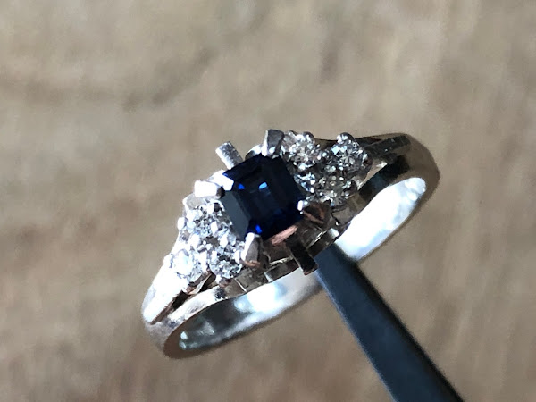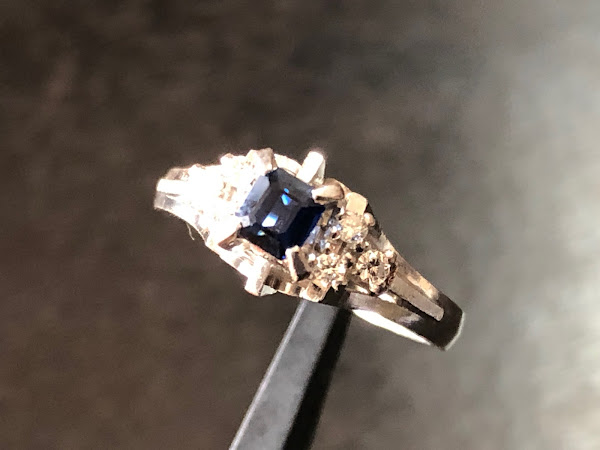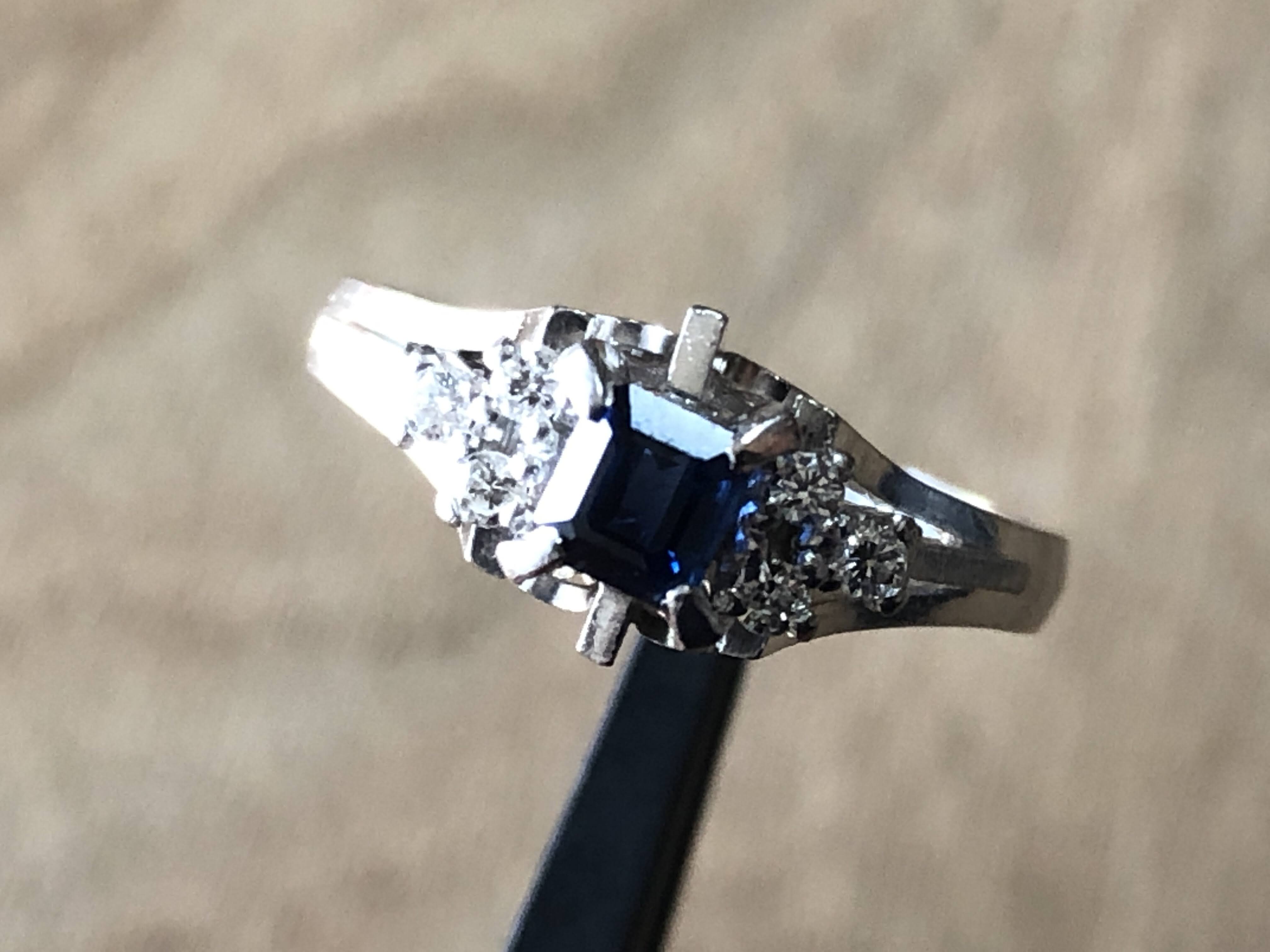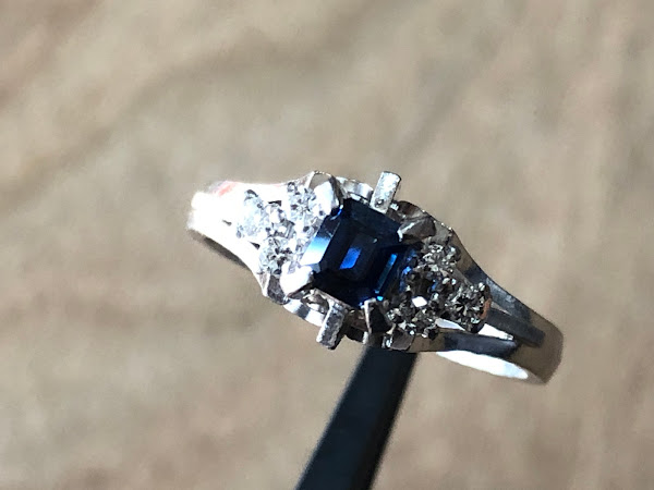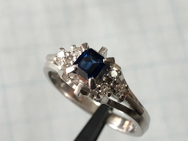 石はエメラルドカットされたサファイア
