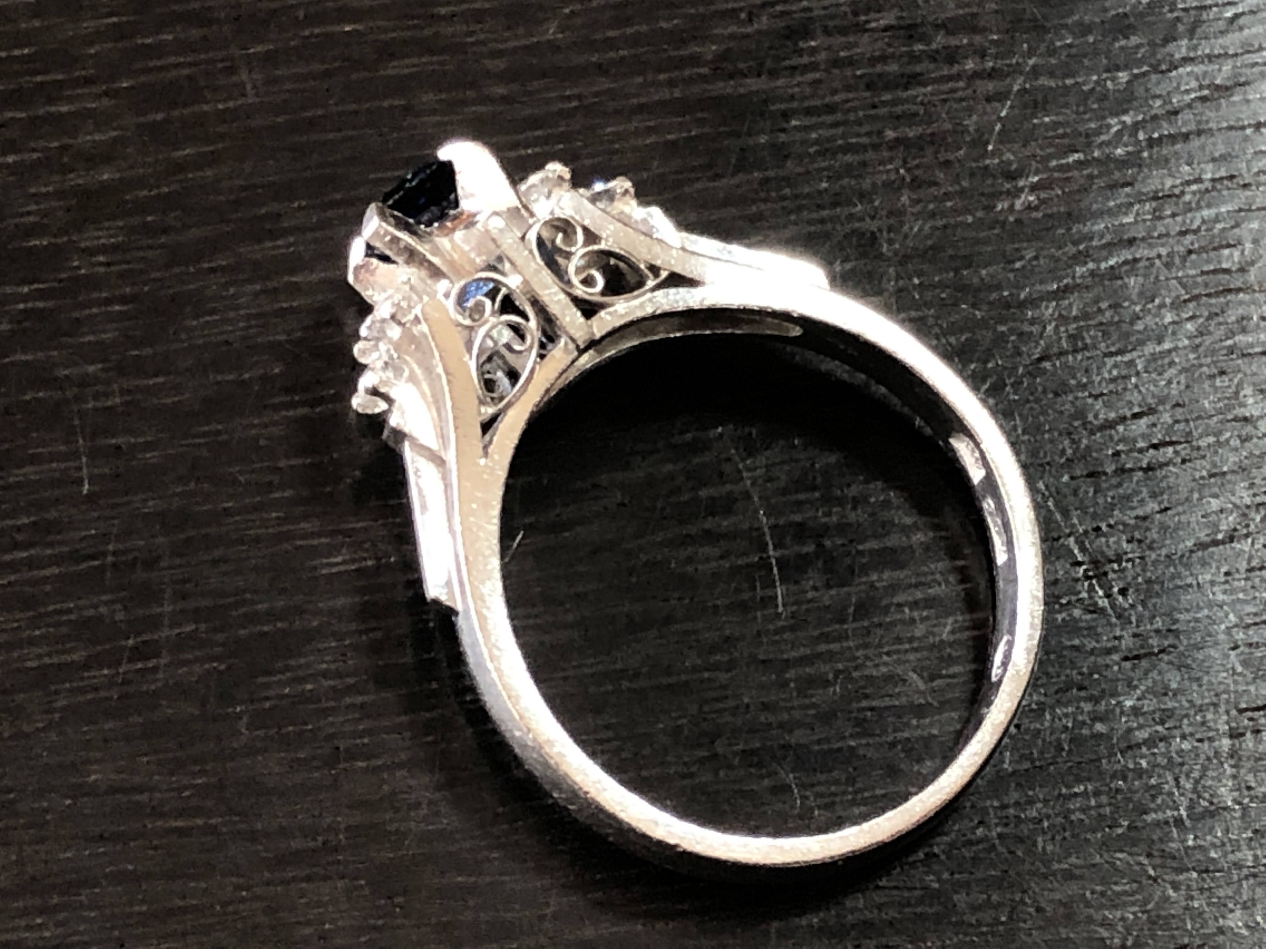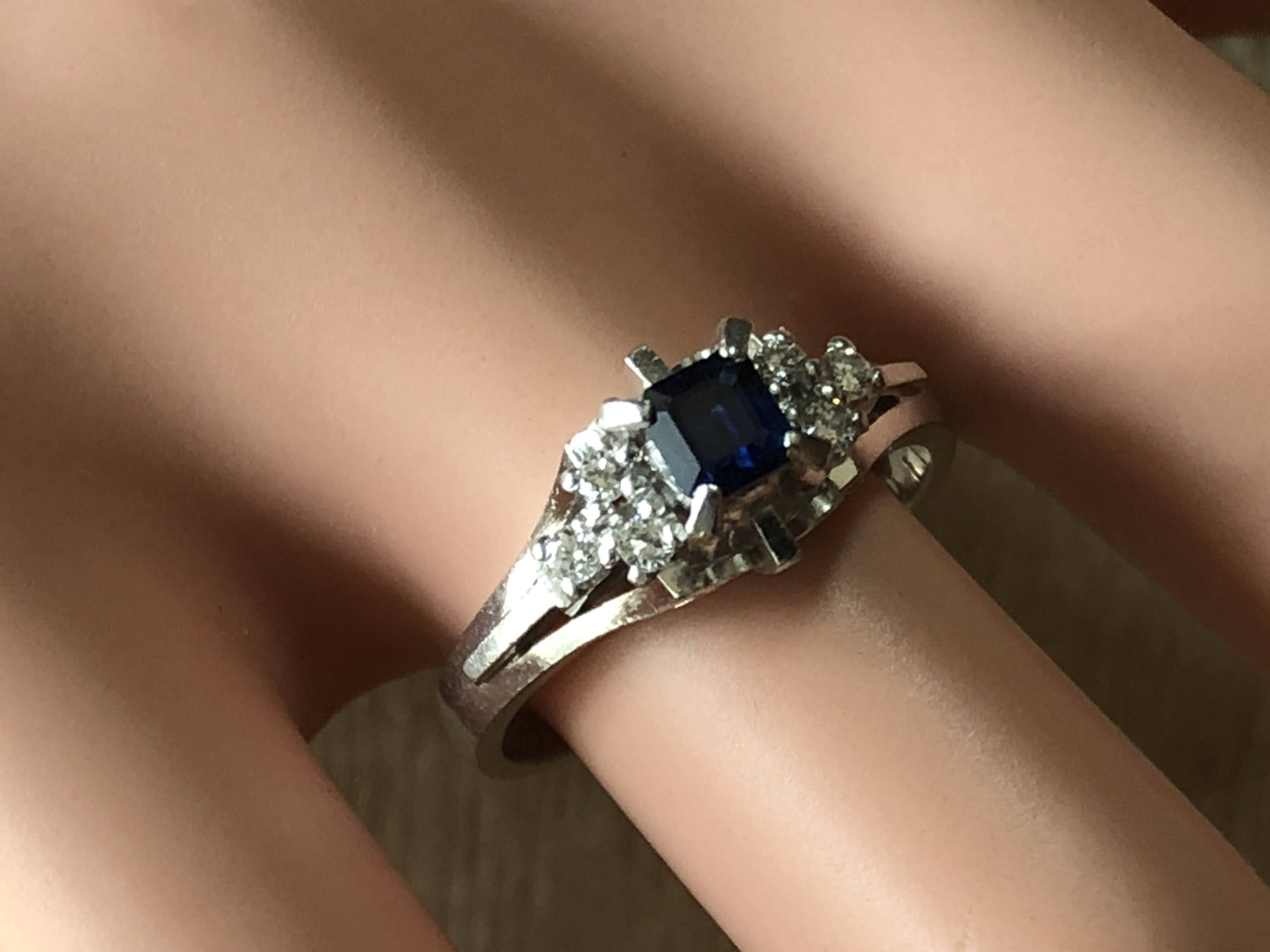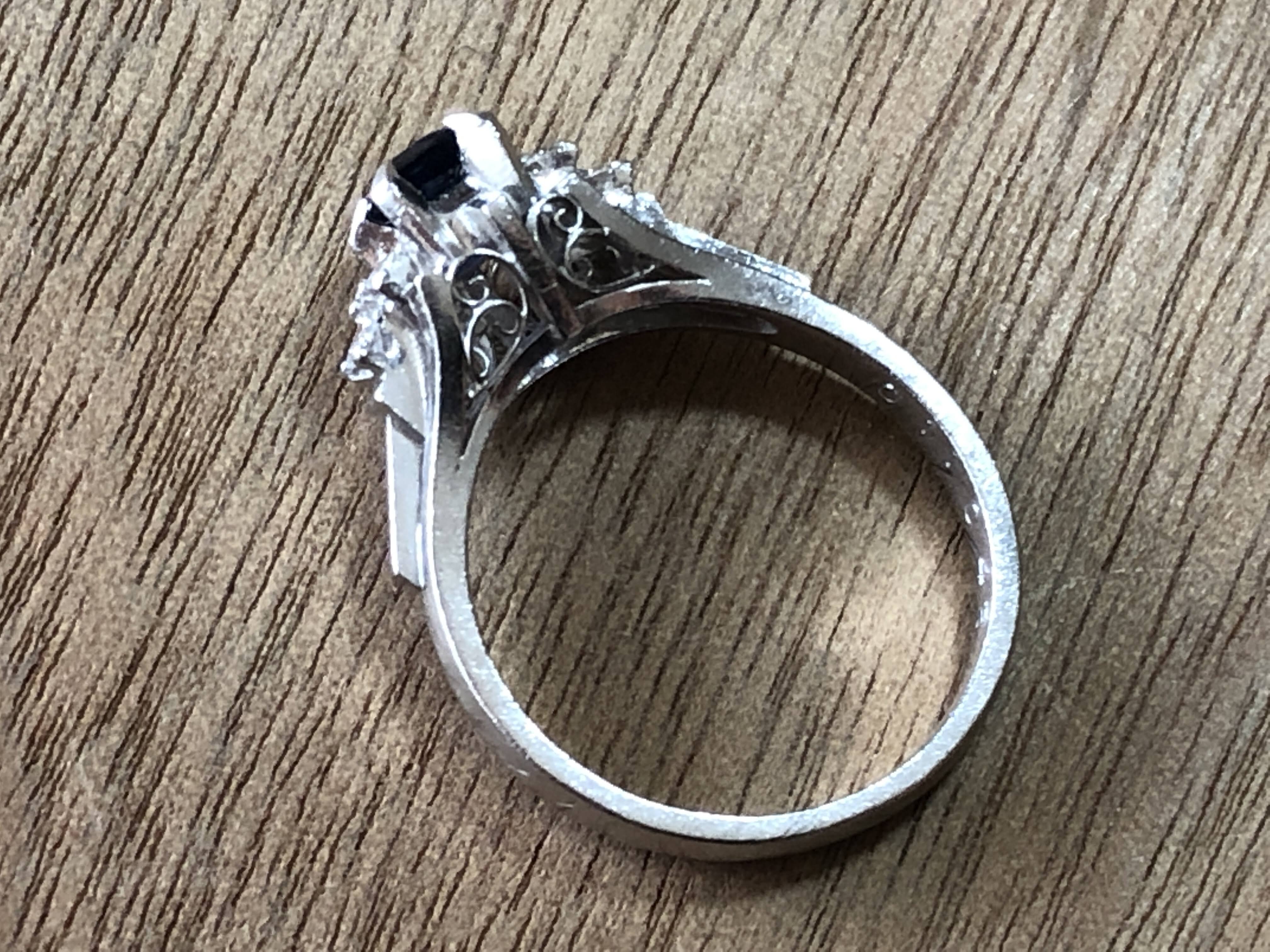 石はエメラルドカットされたサファイア